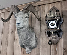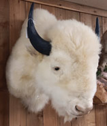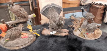 skin rug, coyote skin rug, buffalo skull, turkey in glass display, fisher on log, Dahl sheep head, antelope head,