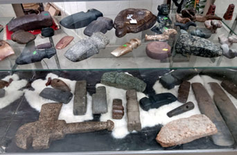 cataloged Indian flint and stone items including flint points up to 20" long, all sizes of stone axes and tomahawks,