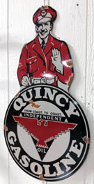 artificial tree in glass pot, baby rocking cradle, office chair, collection of small and large signs advertising oil, gas,