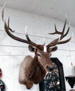 beaver on log, royal elk head, Longhorn steer horns, pair of fallow deer heads on pedestal, caribou head, wild